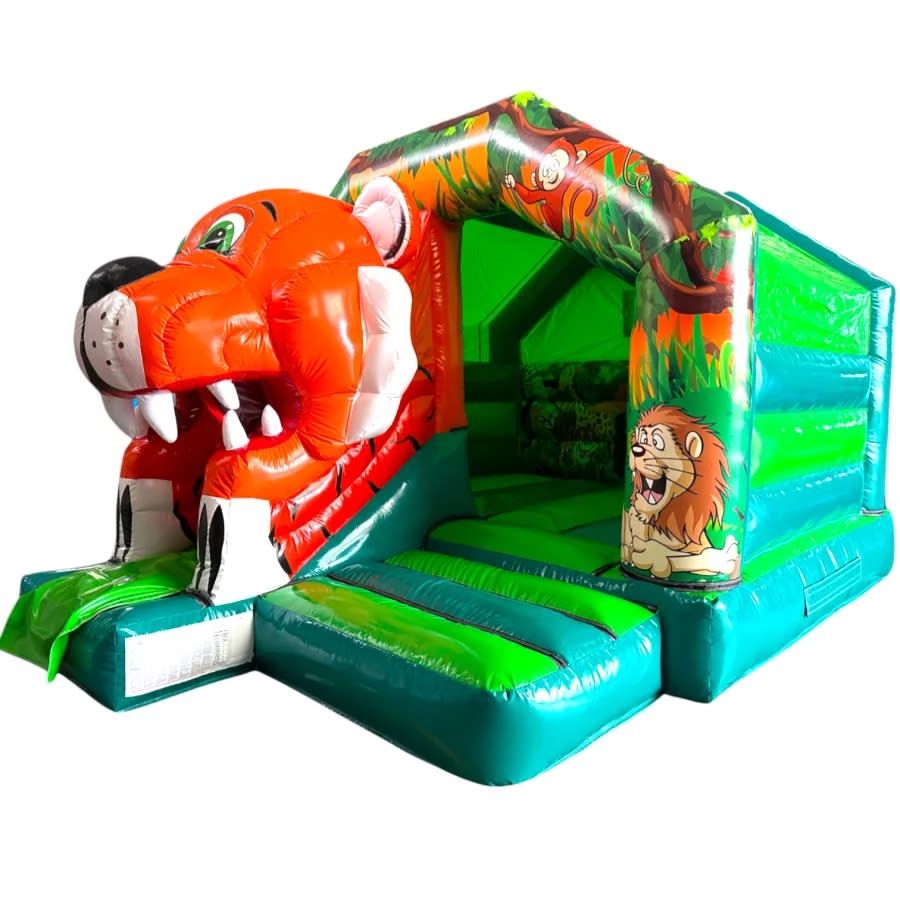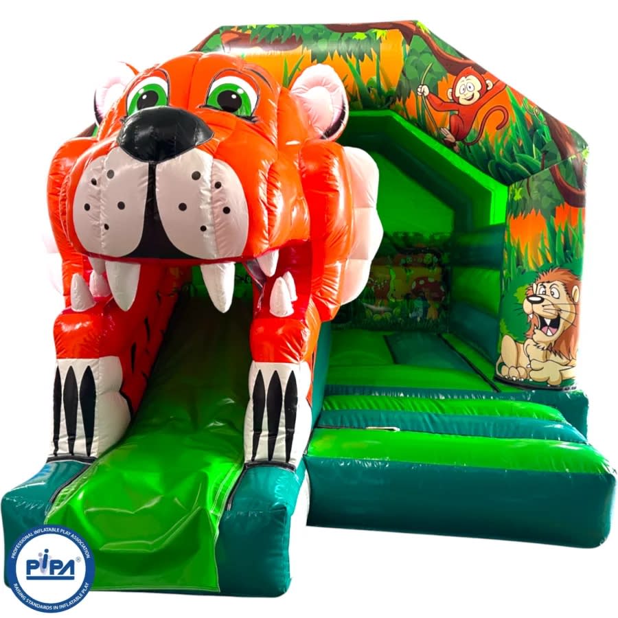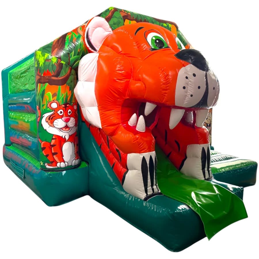 The Jungle Safari Tiger Combo is a premium inflatable featuring a large bouncing area, built-in slide, and disco setup included as standard.